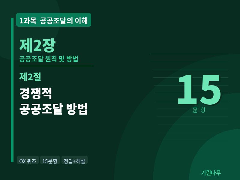 | 공공조달관리사 예상문제 (해설포함) | 1과목 공공조달의 이해 1장 3절 OX 15문항 (2026) (0) | 2026.03.22 |