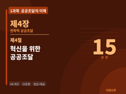 | 공공조달관리사 예상문제 (해설포함) | 1과목 4장 1절 전략적 공공조달 OX 15문항 (2026) (0) | 2026.03.25 |
