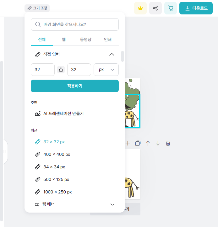 미리캔버스에서 크기 크기조정을 32X32로 맞춘 뒤 요소에서 원하는 이미지를 만들어줍니다.