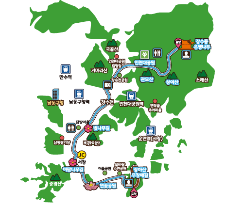 - 인천대공원: 약 1,000여 그루의 벚나무와 넓은 잔디밭