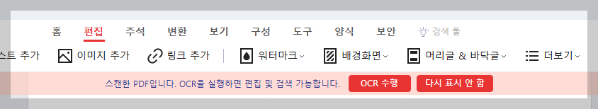 - 상단 메뉴에서 문서 → 편집 → 워터마크 → 추가